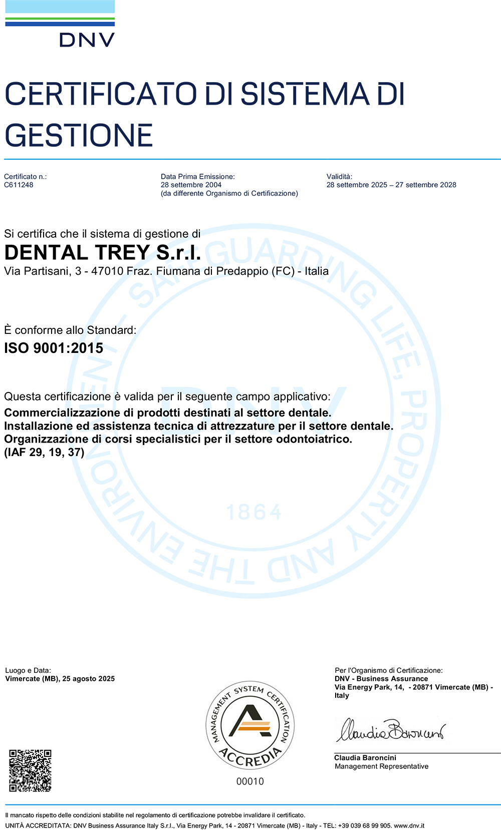 • 1995 Dental Trey si trasferisce nella sede attuale, a Fiumana di Predappio. Un’area di 50.000mq dove è possibile trovare uffici, show-room, aree commerciali e amministrative, sale corsi, centro congressi, studio odontoiatrico, foresteria, piscina, campo da calcio e magazzino