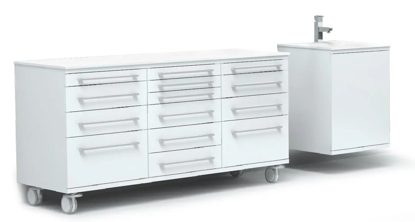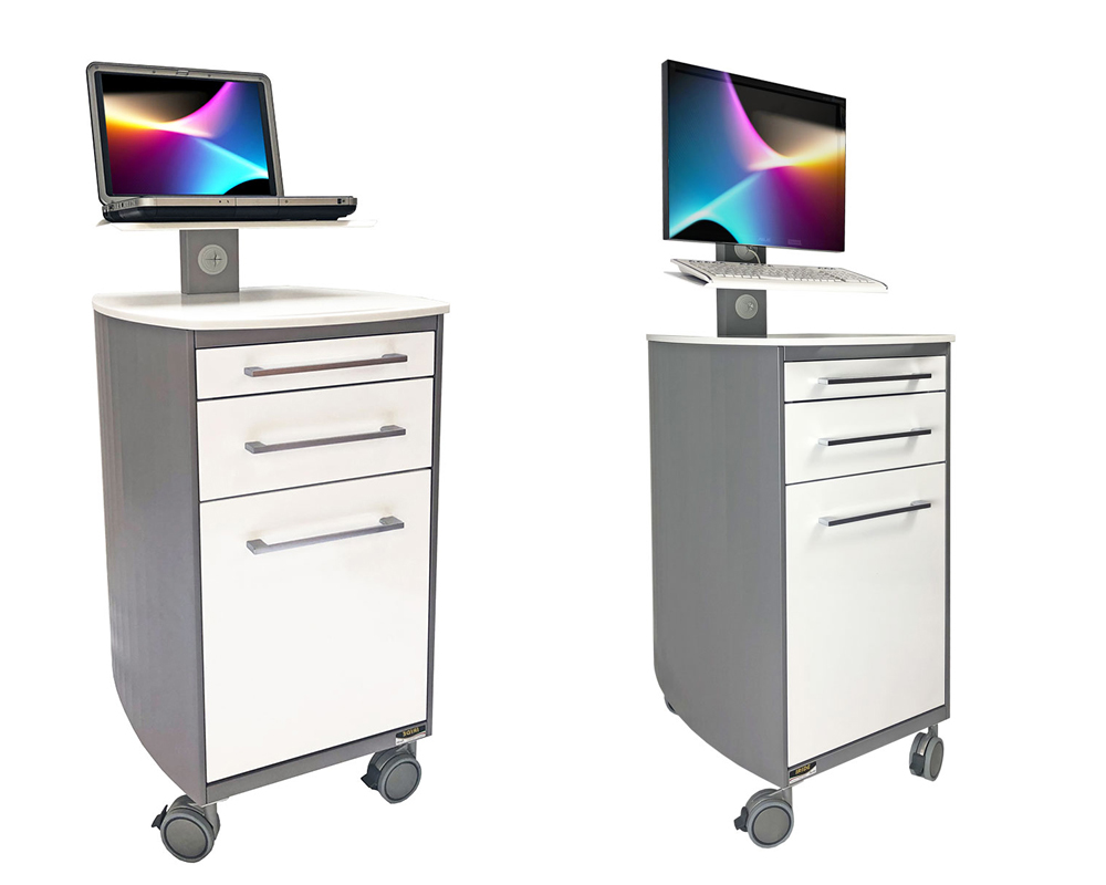 Oltre al piacevole LOOK questo mobile offre al professionista dentale un discreto spazio (soprattutto se si utilizza un computer portatile) dato dagli altri cassetti e dall’anta frontale.